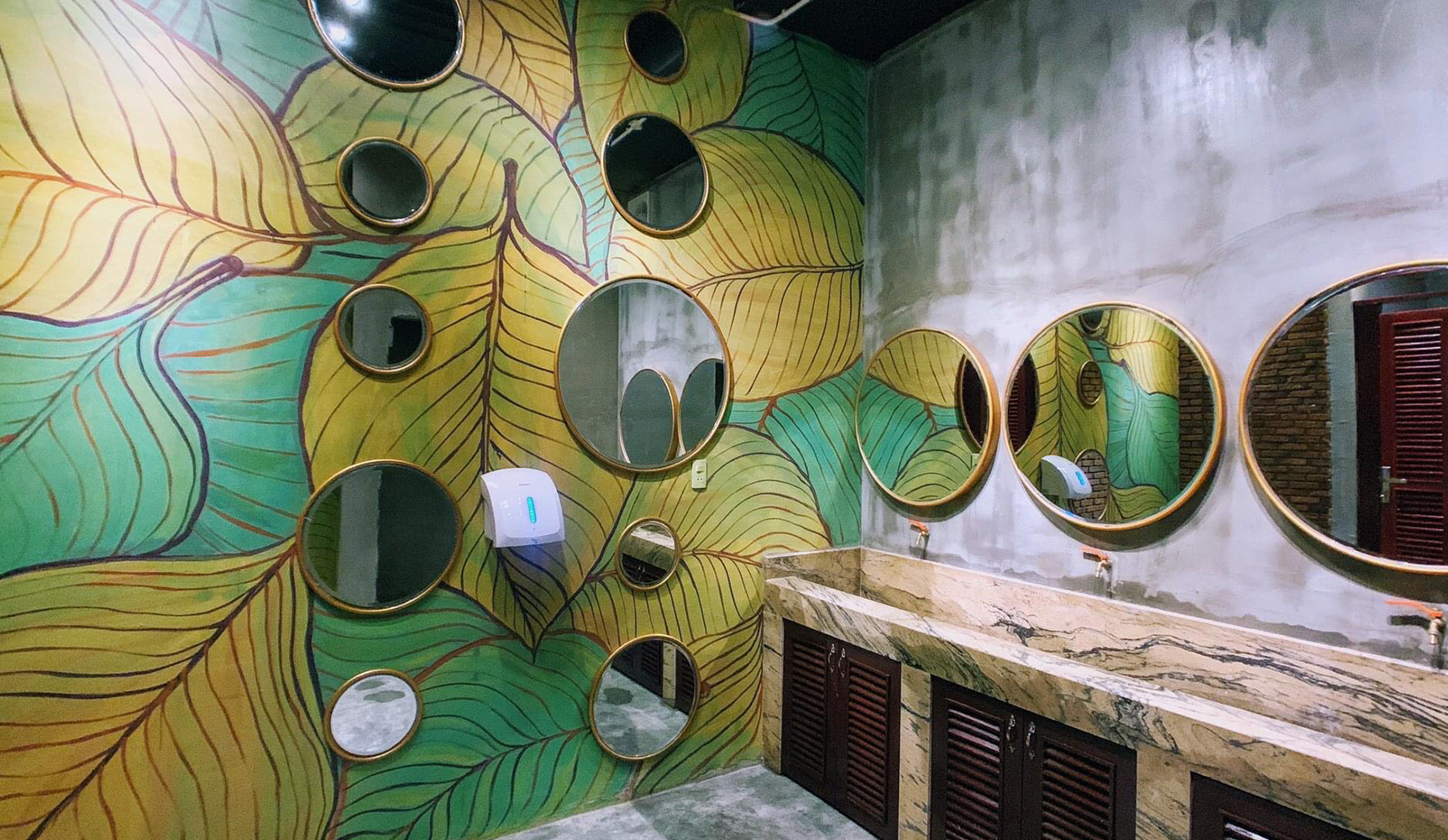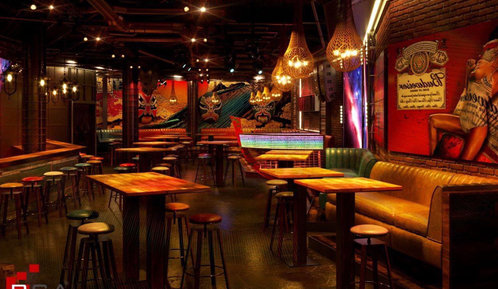 ; thì bạn sẽ còn cảm nhận được rất nhiều dấu ấn du lịch đặc sắc, mang đậm nét văn hóa địa phương qua những “chất liệu” thiết kế độc đáo như: ✔ Bức tường đại dương với biểu tượng cá Bò Gù kết hợp cùng đường nét cổ xưa của những chiếc mặt nạ Tuồng Đào Tấn đầy ấn tượng. ✔ Hay bục DJ với ý tưởng từ một